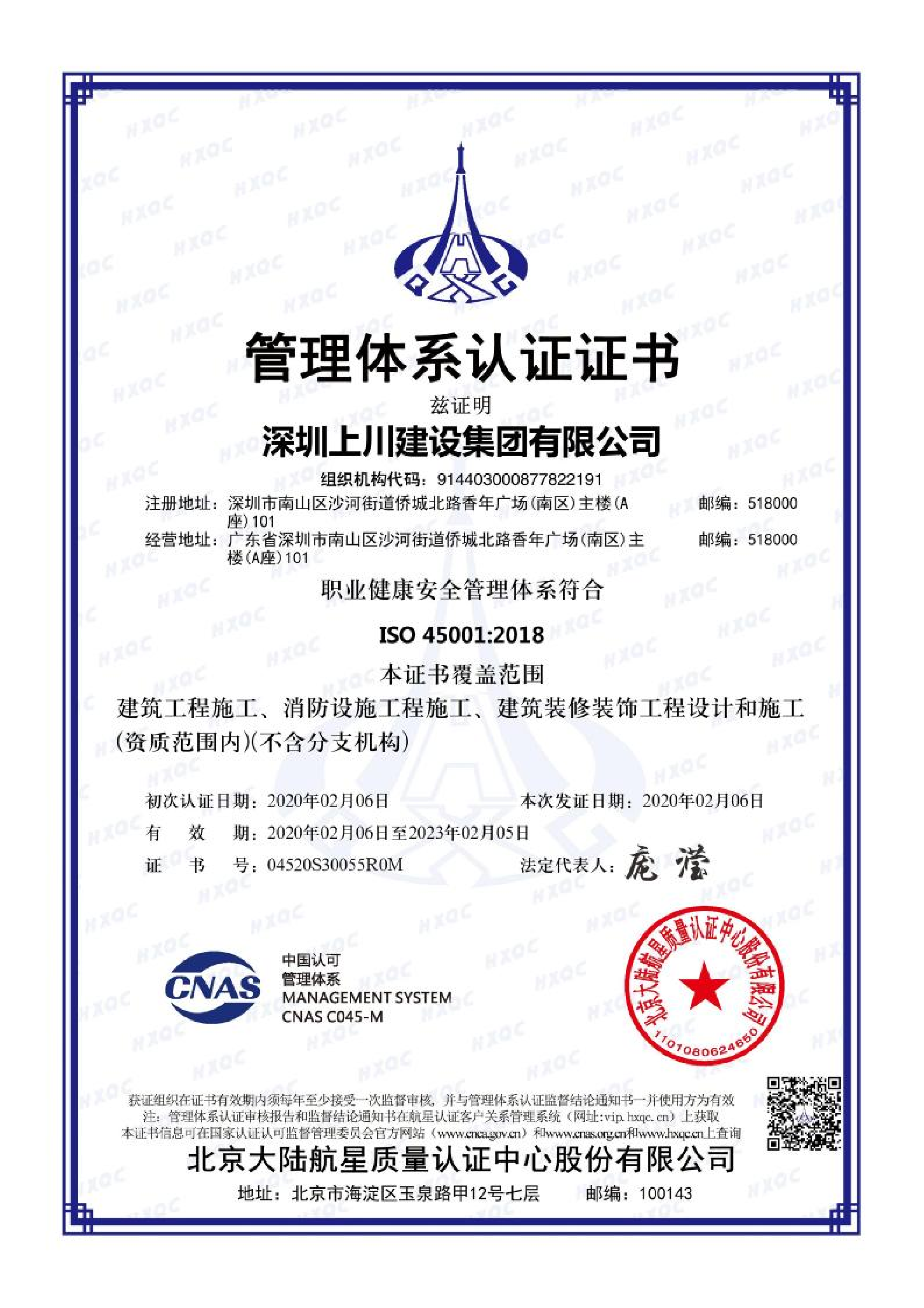 上川建設(shè)-職業(yè)健康安全管理體系認證證書