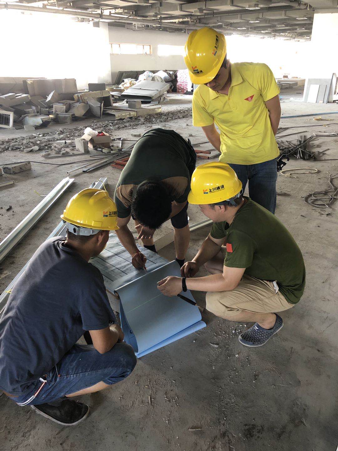 工作人員現場研究討論施工圖紙,嚴格指導工人按圖作業施工,確保工程進度按照上川建設的工藝流程,有序開展。
