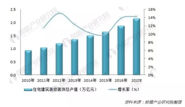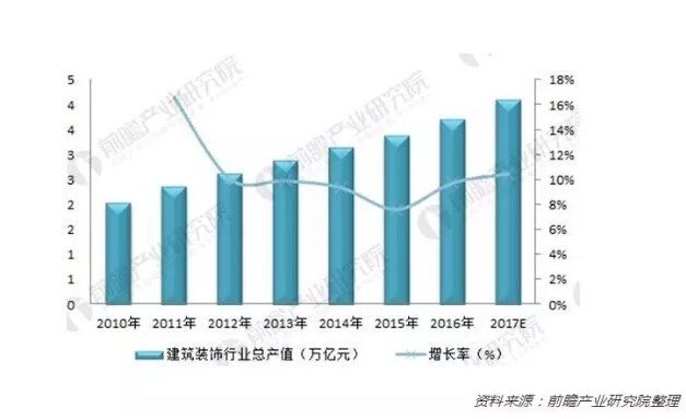 根據(jù)中國(guó)建筑裝飾協(xié)會(huì)的數(shù)據(jù)顯示,2016年全國(guó)建筑裝飾行業(yè)完成工程總產(chǎn)值3.73萬(wàn)億元,比2015年增加了3400億元,增長(zhǎng)幅度為9.7%。比宏觀(guān)經(jīng)濟(jì)增長(zhǎng)速度高出3個(gè)百分點(diǎn),體現(xiàn)了建筑裝飾行業(yè)在國(guó)民經(jīng)濟(jì)發(fā)展中的基礎(chǔ)性和超前性。預(yù)計(jì)在2017年宏觀(guān)經(jīng)濟(jì)回暖的情況下,建筑裝飾行業(yè)工程總產(chǎn)值有望進(jìn)一步增長(zhǎng)至4.12萬(wàn)億元,較2016年增長(zhǎng)10.46%。