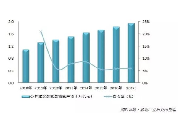 其中,公共建筑裝修裝飾2016年全年完成工程總產(chǎn)值1.84萬(wàn)億元,比2015年增加了1000億元,增長(zhǎng)幅度為5.7%。近年來(lái),受反腐沖擊和非住宅類(lèi)房屋竣工速度提升緩慢的影響,公共裝修總產(chǎn)值增速有所下滑。