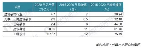 圖表4:“十三五”期間建筑裝飾行業(yè)規(guī)模發(fā)展空間預(yù)測(cè)(單位:萬(wàn)億元,%)